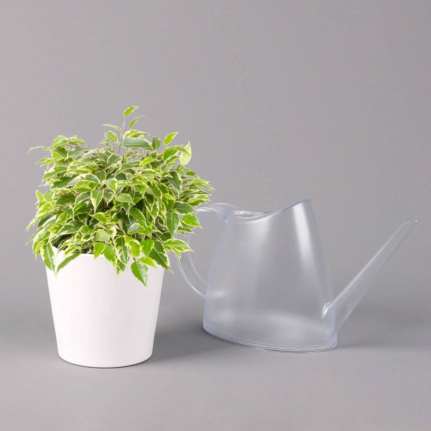 Die Birkenfeige (Ficus benjamina), bei uns auch unter den Namen ‚Benjamini‘ oder einfach nur ‚Ficus‘ bekannt, ist eine klassische Grünpflanze für Zimmer und Büro, die sich seit vielen Jahren großer Beliebtheit erfreut. Charakteristisch sind die elliptischen, zugespitzten Blätter, die je nach Art rein grün oder mit weißer bis gelber Panaschierung versehen sind. Die glänzenden, glatten Blätter sitzen an auffallend dünnen Zweigen, die an den Spitzen leicht überhängen. Die Sorte ‚Kinky‘ kann bei guter Pflege bis zu knapp 1 Meter hoch werden.