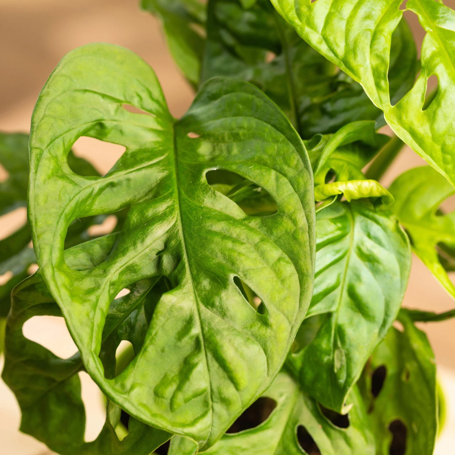 Das Schiefe Fensterblatt (Monstera adansonii) gilt als absolute Trendpflanze und bietet mit seiner außergewöhnlichen Optik die optimale Grundlage für echtes Dschungelfeeling in Ihrem Zuhause. Charakteristisch sind die elliptischen, zugespitzten Blätter, welche von mehreren Durchbrüchen durchzogen sind. Das verleiht der Pflanze ihr löchriges Aussehen und ihren Beinamen ‚Swiss Cheese Plant‘ (zu deutsch: ‚Schweizer Käse-Pflanze‘). Die Blätter sind kräftig grün uns sitzen an langen Stielen. Die Monstera ist eine Kletter- und Rankpflanze und bildet Luftwurzeln aus, mit denen sie sich in der Natur an Felsen und Baumstämmen emporrankt. Bei der Zimmerkultur kann der Pflanze eine Rankhilfe in Form eines Moosstabs zur Verfügung gestellt werden. Ohne Rankhilfe wächst das Fensterblatt überhängend und kann auch in einer Blumenampel kultiviert werden. Kletternd kann die Pflanze Höhen von bis zu 3 Metern erreichen.