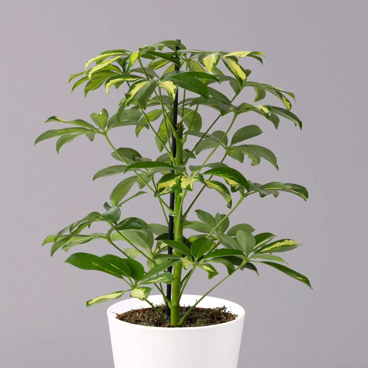Die Strahlenaralie (Schefflera arboricola) zählt zu den beliebtesten Büropflanzen, da sie sehr robust und besonders schnellwüchsig ist. Die ursprünglich aus Taiwan stammende Tropenpflanze besticht mit den typisch strahlenförmig angeordneten Blättern, die kräftig grün und glänzend sind. Die Pflanze wächst schlank aufrecht und kann bis zu 2 Meter hoch werden. Ab einer gewissen Höhe bietet sich ein Moosstab als zusätzliche Fixierung an, welcher der Pflanze als Stütze dient.