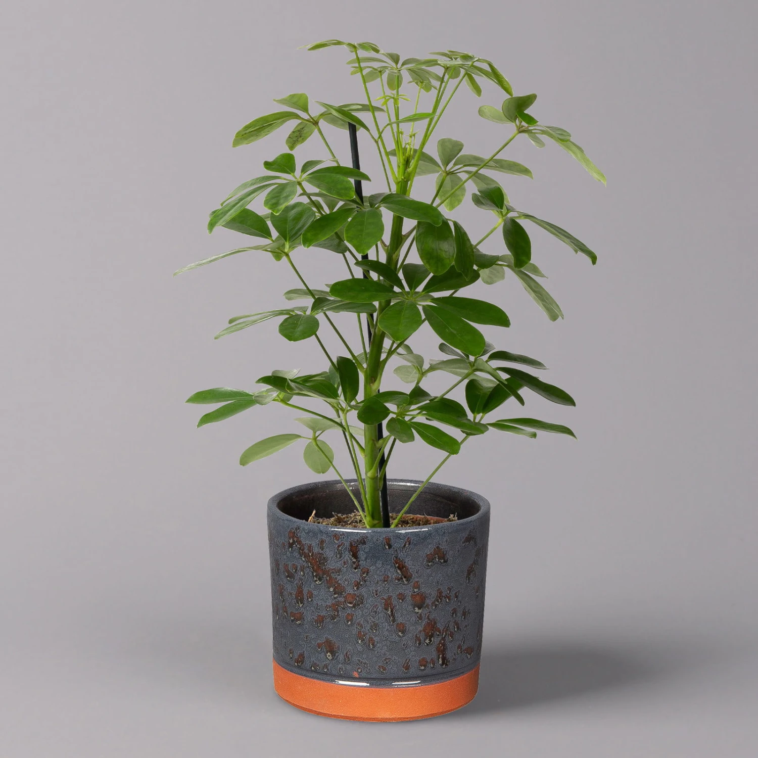 Die Strahlenaralie (Schefflera arboricola) zählt zu den beliebtesten Büropflanzen, da sie sehr robust und besonders schnellwüchsig ist. Die ursprünglich aus Taiwan stammende Tropenpflanze besticht mit den typisch strahlenförmig angeordneten Blättern, die kräftig grün und glänzend sind. Die Pflanze wächst schlank aufrecht und kann bis zu 2 Meter hoch werden. Ab einer gewissen Höhe bietet sich ein Moosstab als zusätzliche Fixierung an, welcher der Pflanze als Stütze dient.
